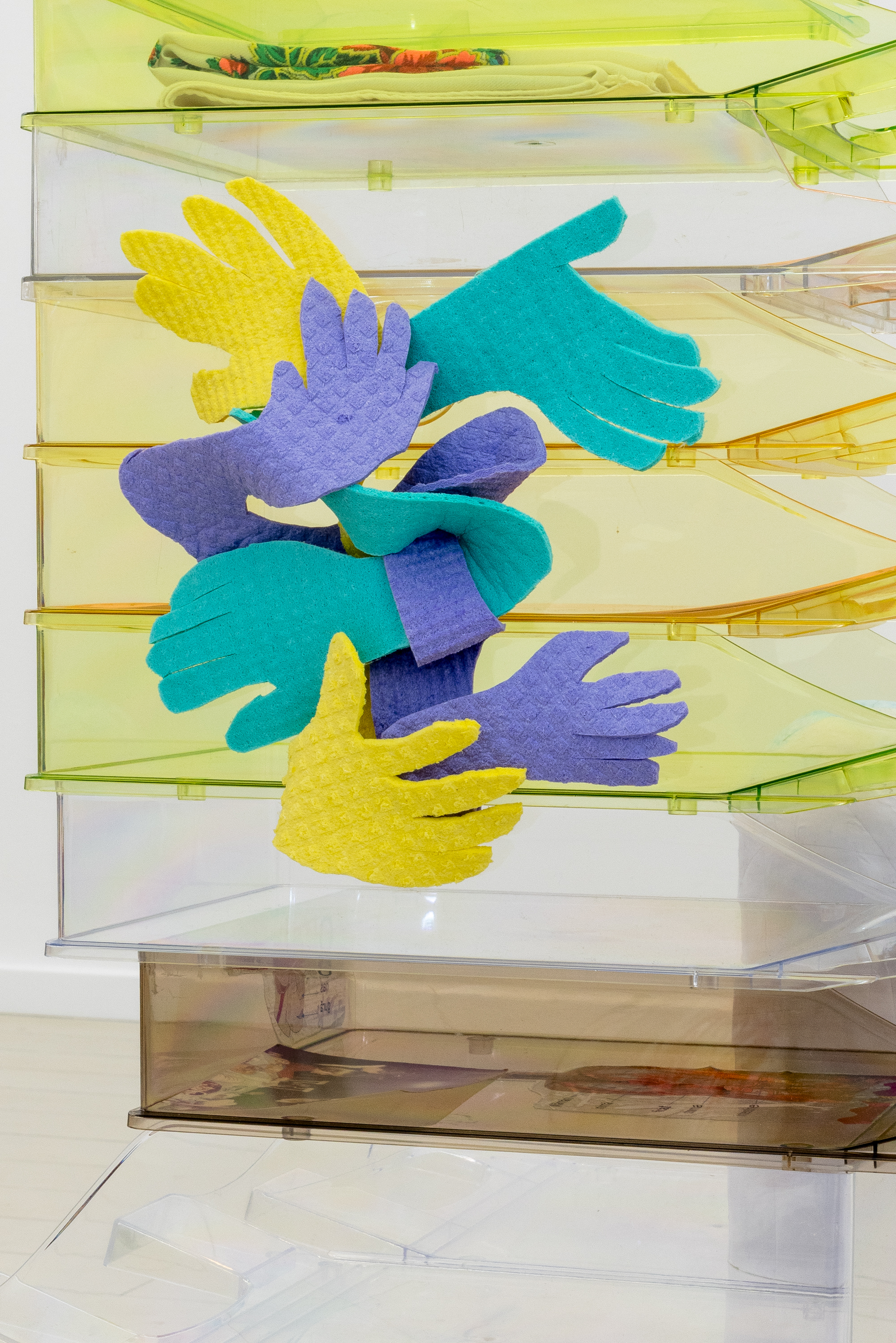2019 . sponge cloths, acrylics, glass, wood, paper, paste, cotton bed linen