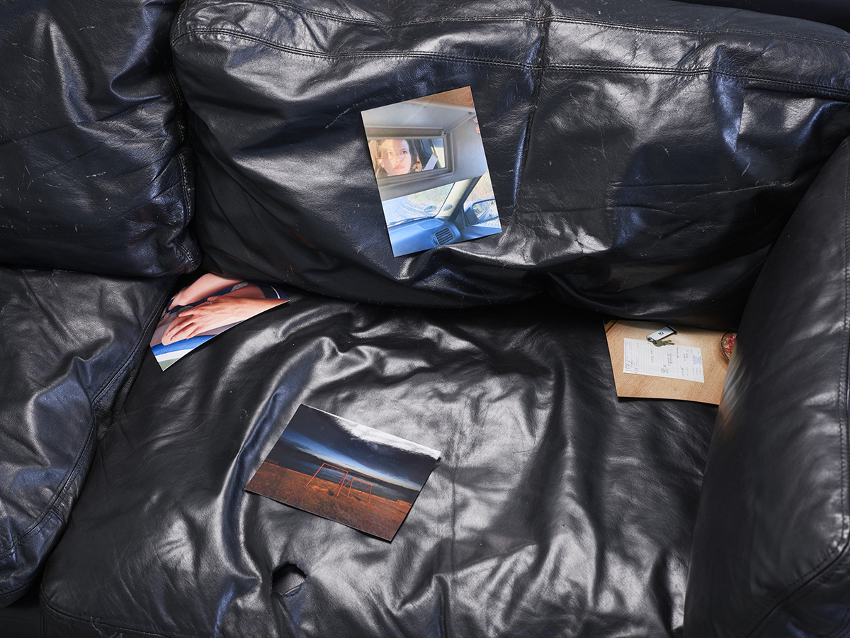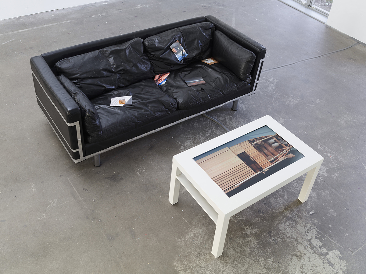 Designklassiker . 2024 [IKEA leather couch, aluminum tape, photographs, 185 x 80 x 65cm]